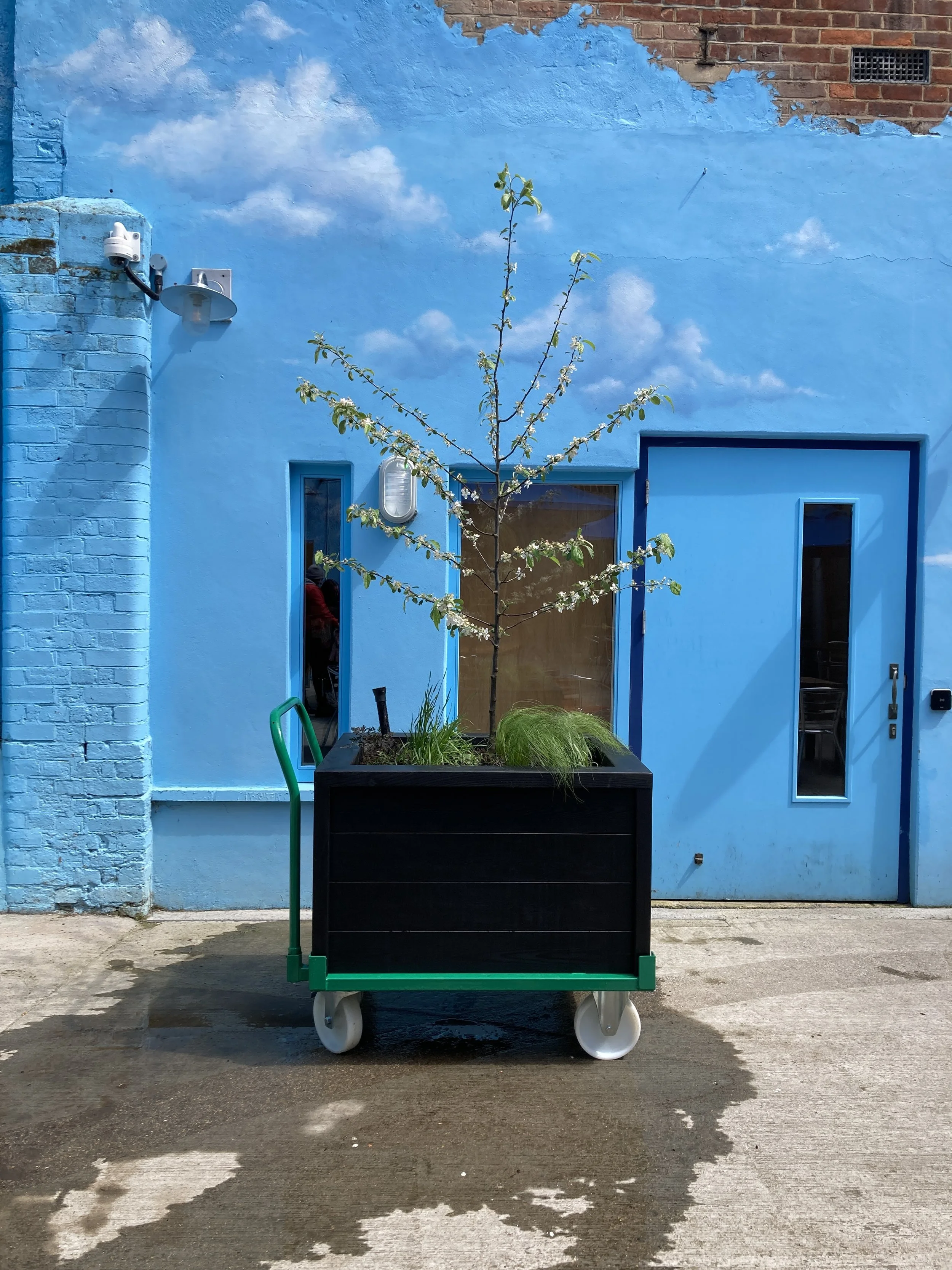 The Story Museum asked us to design and plant three planters for their main courtyard. We delved into the history of the site and found that it used to be a Royal Mail sorting office, telephone exchange and college buildings. Hence we came up with using a pallet dolley such as those used by post office staff to house our planters. We had these specially built with an internal water system at the base to keep the trees hydrated. Three distinct schemes were planned for each container. The one shown is a Malus ‘Evereste’ (crab apple) with grasses and meadow style planting at the base. Another was an Arbutus Unedo (strawberry tree) underplanted with ferns and wild strawberries and lastly a Corylus avellana ‘Contorta’ (contorted hazel) underplanted with Japanese forest grass. We used photoshop and pictures taken on site to make montages to communicate our designs.